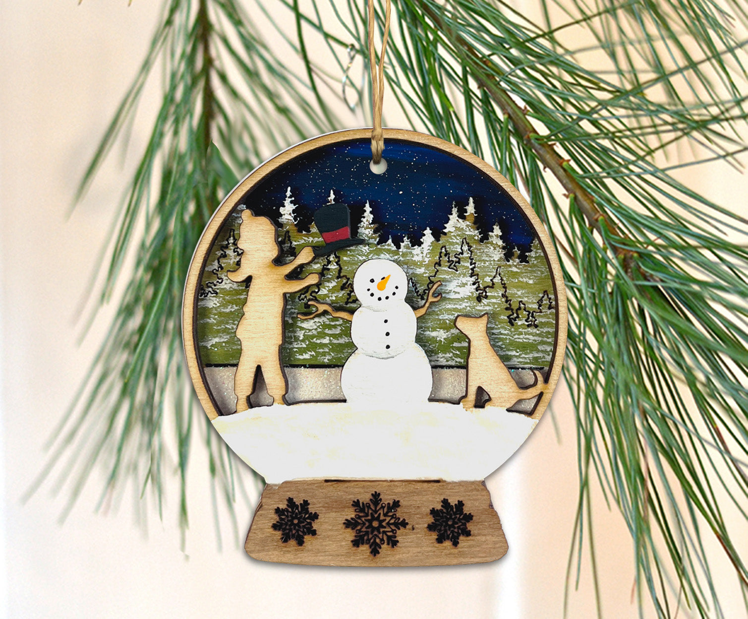 Bring the joy of a snowy day to your tree with this enchanting snow globe ornament featuring a child building a snowman scene. It truly captures the heart and magic of the wonders of winter.