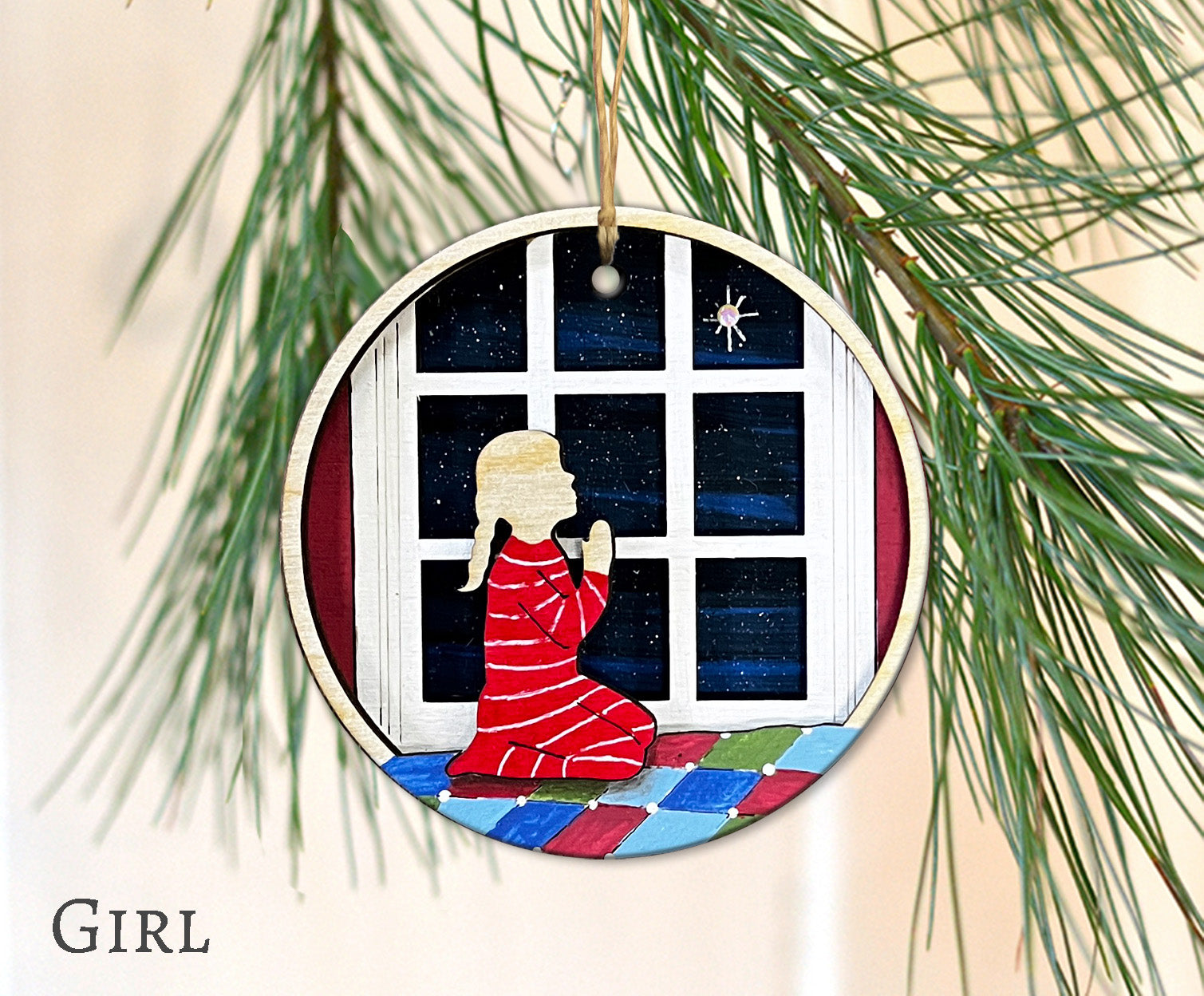 Capture a quiet moment of innocence and faith with this touching ornament of a child saying their prayers while looking at a starry sky, a beautiful reminder of quiet nights and heartfelt hopes. Designed and hand painted in upstate NY.